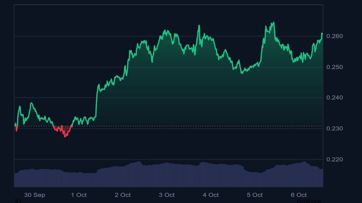 DOGE swung through a $0.014 corridor, peaking at $0.265 and bottoming at $0.251.