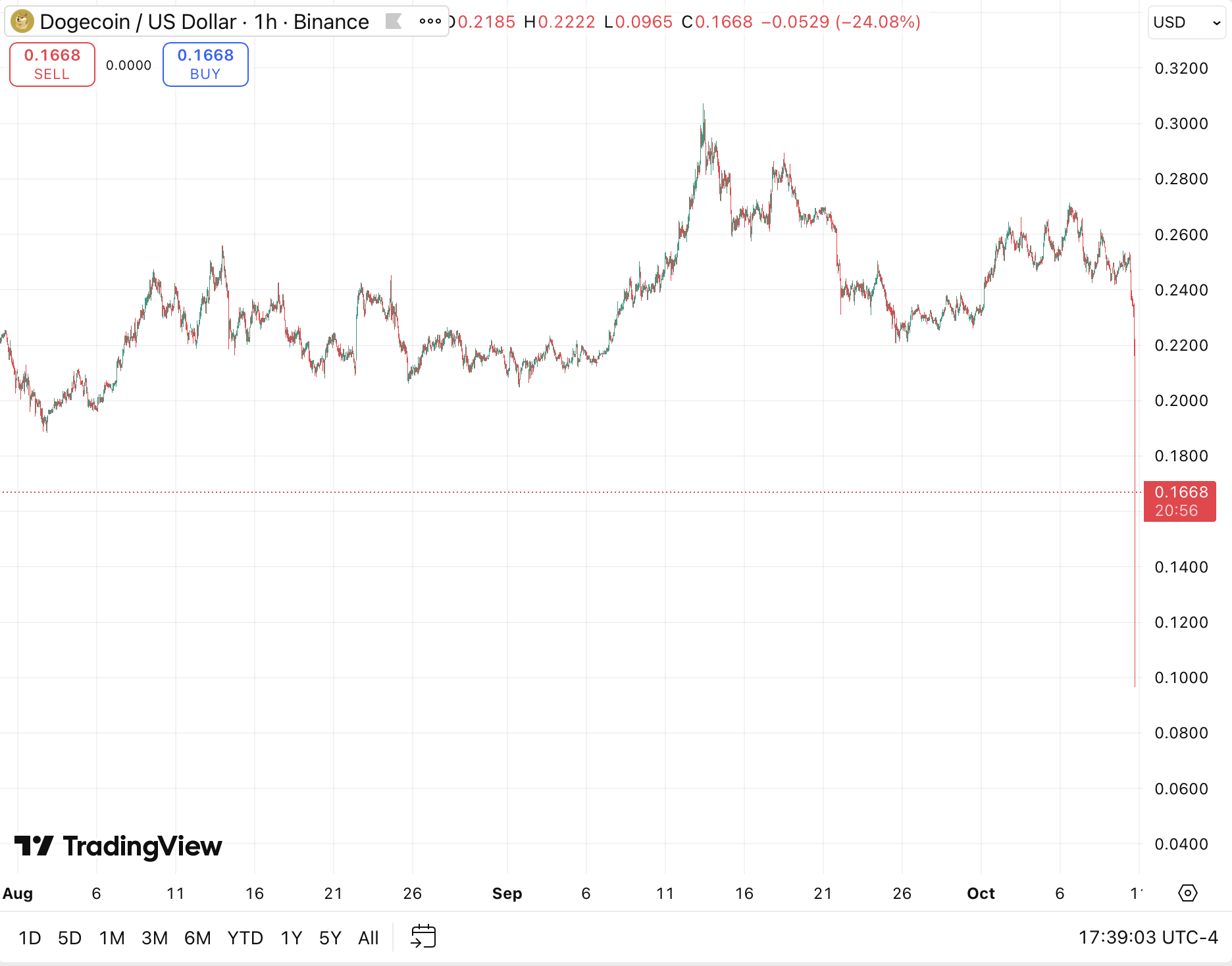 Dogecoin (DOGE) has suffered a major downturn this week, falling 34.7% over the past seven days and trading around $0.1690, according to CoinMarketCap. The memecoin’s decline accelerated in the last 24 hours as the broader crypto market faced heavy liquidations, with Bitcoin crashing below $107,000 and over $5 billion in leveraged positions wiped out.