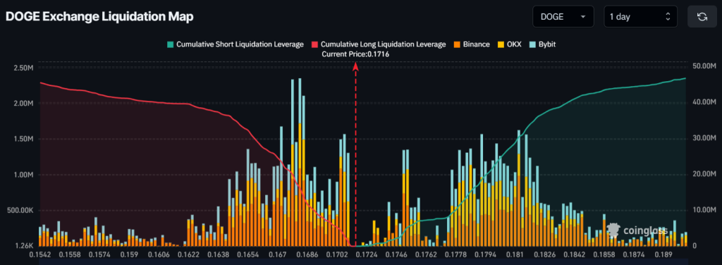 Intraday traders appear bullish on DOGE, with a significant long bias, according to on-chain data from Coinglass. Analysis reveals over-leveraged positions: $16.20 million in long positions at $0.168 and $5.30 million in short positions at $0.175.