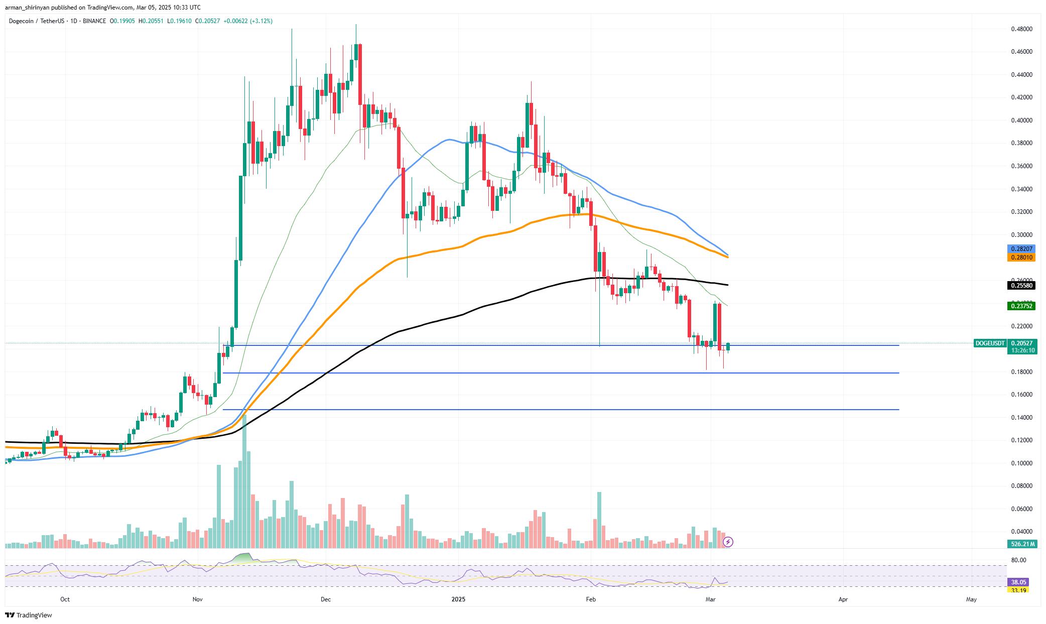 Recent price action, characterized by lower highs and weaker rebounds, shows a persistent downtrend since its peak above $0.40. Dogecoin is currently battling to hold above key support levels, with $0.19 acting as a crucial threshold.
