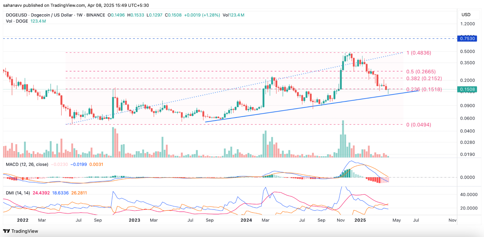The weekly Dogecoin price chart shows a bullish trend, with the price rebounding from an ascending support line. Currently consolidating around the 0.236 Fibonacci retracement level after failing to surpass the 0.382 level (approximately $0.21). However, decreasing selling pressure, as evidenced by the MACD indicator, suggests a potential bullish crossover. Conversely, the Directional Movement Index (DMI) presents a bearish outlook due to a divergence between +DI and -DI.