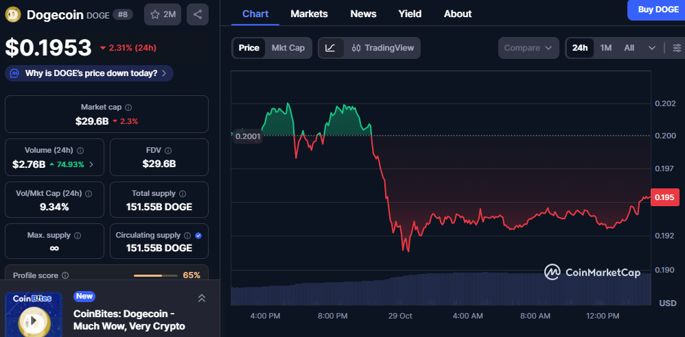 - The Dogecoin price fell 2.31% to $0.1953, signaling a short-term market correction rather than a structural downturn.