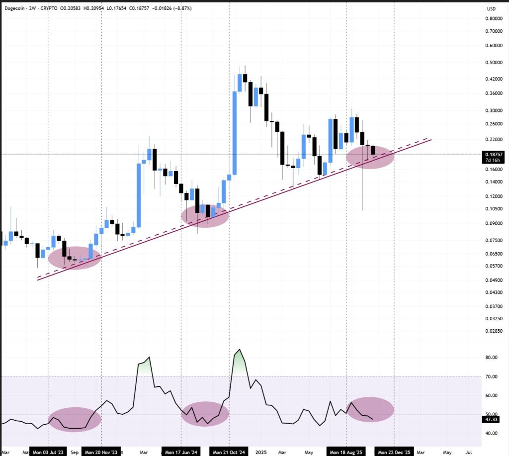 RSI at the bottom is telling a similar story. It’s back in the same low zone that marked the beginning of previous rallies. Compression like this often shows sellers are running out of steam, which is exactly when DOGE has turned upward before.