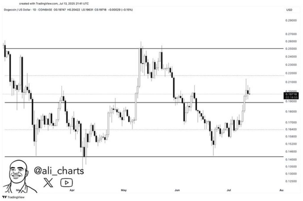 Since reaching a low near $0.15 in June, Dogecoin has established a consistent pattern of higher lows. This upward structure suggests a potential shift in trend, favoring buyers. An earlier rally in July propelled the price near $0.21, confirming the breakout through $0.19 with conviction.