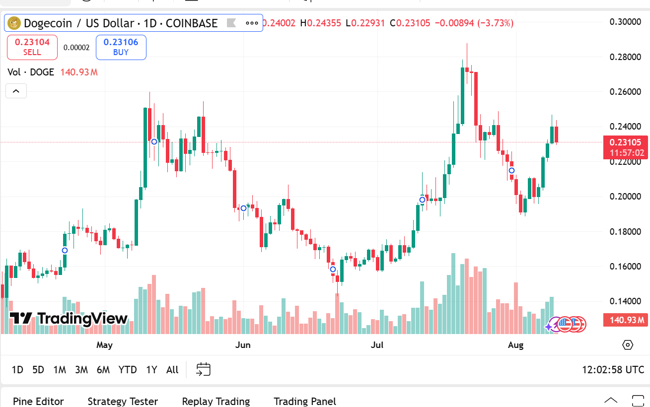 Dogecoin is currently valued at $0.2320, reflecting a 2.23% decrease over the past 24 hours. Its market capitalization stands at a substantial $34.95 billion, supported by a trading volume of $3.27 billion, which has increased by 22.88%. This surge in trading volume indicates heightened market activity despite the recent price dip. This increased liquidity could potentially facilitate a resurgence of DOGE, should buying pressure intensify.