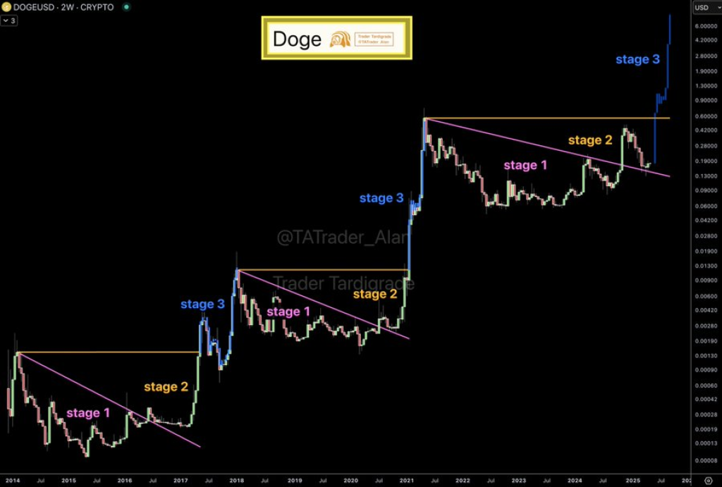 The chart illustrates a three-stage pattern in Dogecoin's price behavior, outlining the progression of each bull run. All signs currently point towards the commencement of the final, and most impactful, phase.