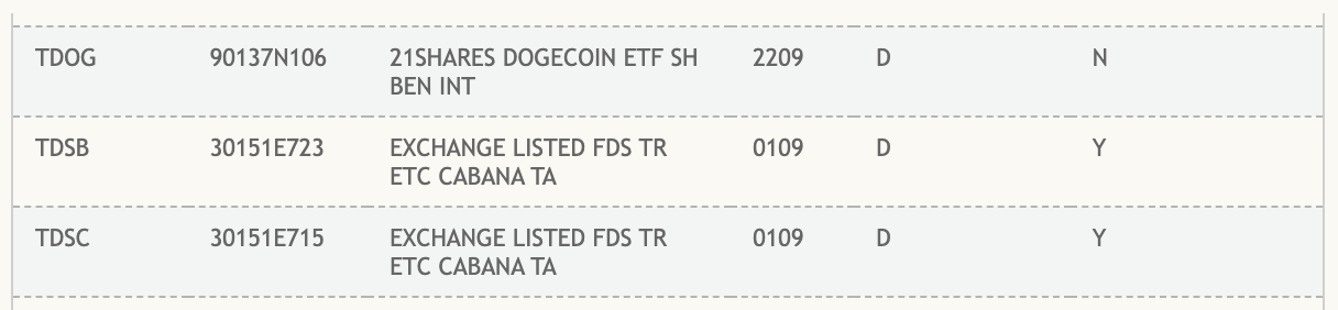As of Sep. 23, the updated DTCC list shows that the Swiss asset management firm’s DOGE ETF has been cleared for listing and settlement. (See below.)