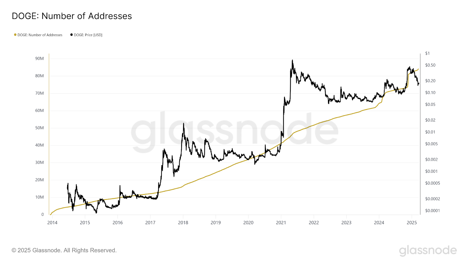 This resilience is supported by Glassnode data revealing a growth in long-term holders. The number of DOGE addresses has surpassed 85 million, an all-time high. While the price is stable, the increasing number of wallets indicates sustained user engagement.