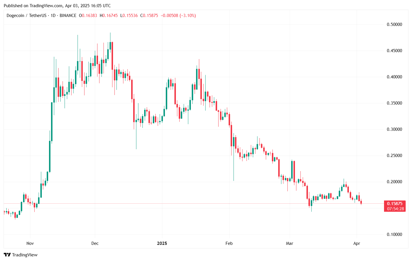 As of April 3rd, DOGE is priced around $0.157. Crypto analyst Ali Martinez has highlighted $0.16 as a critical support zone. Martinez believes maintaining this level could trigger a rally towards $0.57 – a 250% gain from the current price.