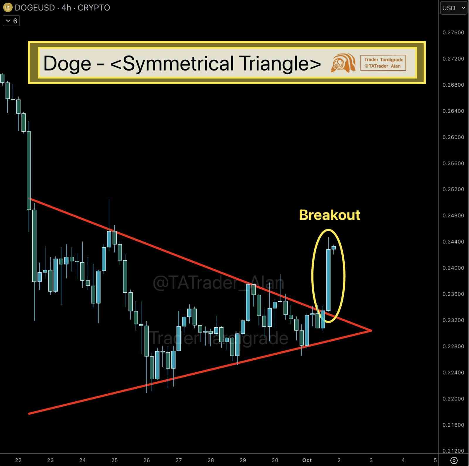 As shown by the recent DOGE price, a breakout from a symmetrical triangle typically signals a bullish continuation. The chart indicates that the range was tightening as lower highs aligned with higher lows, culminating in a final surge. This breakout was confirmed by significant buying, suggesting that demand has surpassed resistance and the market is turning bullish.