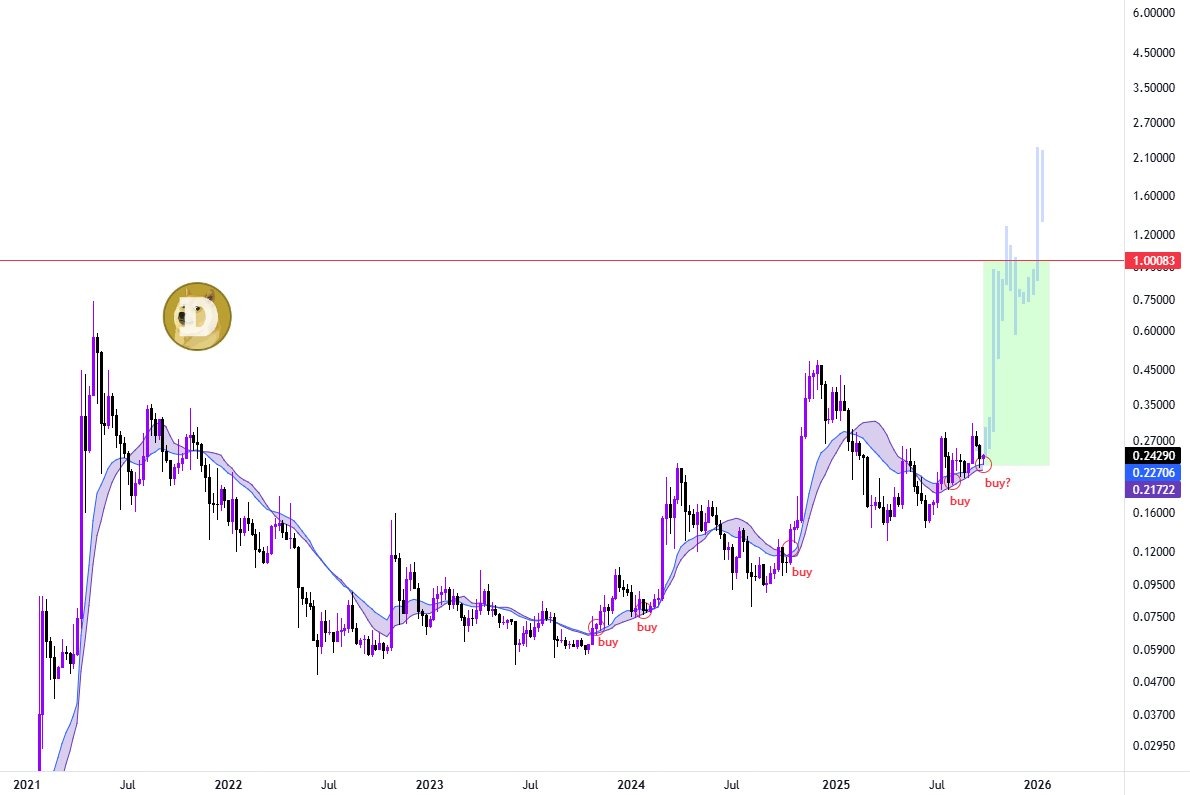 More so, price action is placed higher, above moving averages, while annotations are shown with repeated buy zones throughout 2023-2025. A breakout channel out of present levels may eventually lead to $1.00 and above, with the possibility of reaching $1.50- $2.10 should cycles be favorable.