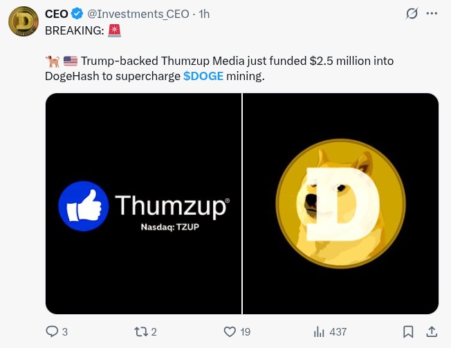 Moreover, new developments in the crypto market are in support of this bullish argument. According to reports, Trump-supported Thumzup Media invested $2.5 million in DogeHash to accelerate the DOGE mining capacity. This action renders the infrastructure network authoritative, generating liquidity, with advances in mining operations enhancing security, investor confidence, and market depth.