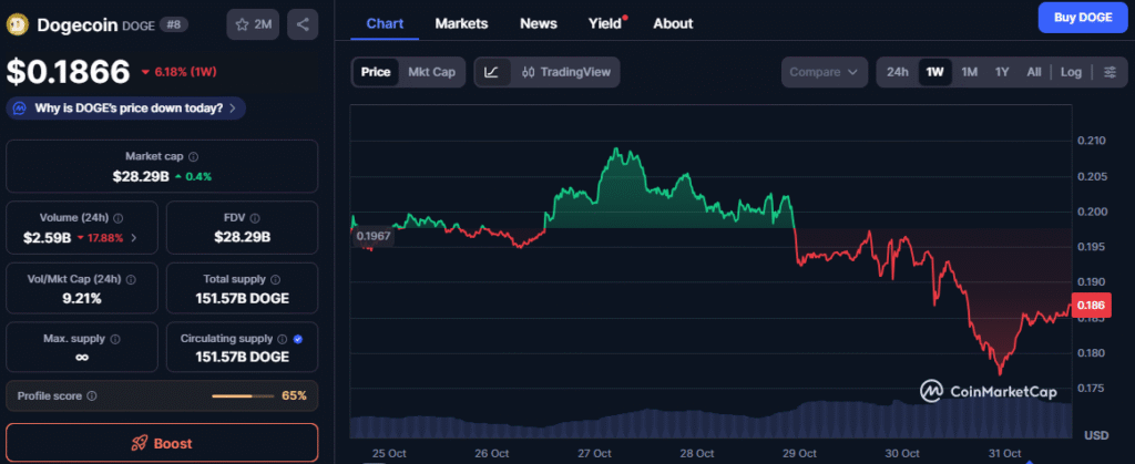 At press time, Dogecoin is trading at $0.1866, representing a 6.18% decline over the past week. The chart indicates immediate support near $0.182 and resistance around $0.205.
