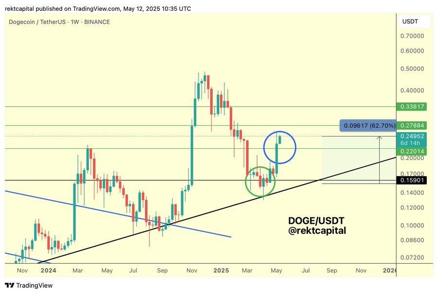 Rekt Capital's chart illustrates a breakout from pre-halving resistance followed by a successful retest. The green zone on the chart is forming a new support base, suggesting continued upward movement if the structure remains intact. DOGE has recently traded between $0.22 and $0.24.