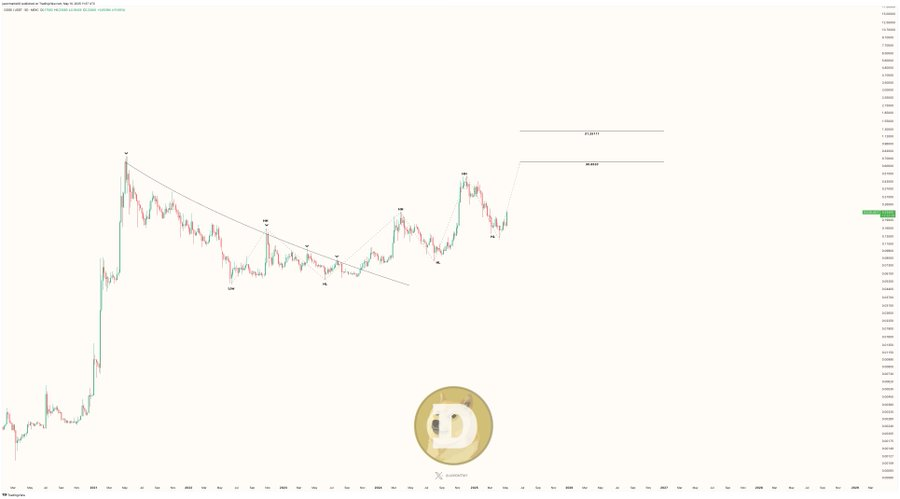 Javon Marks observes that DOGE has broken a long-term downtrend initiated after its 2021 peak at $0.70. The coin has since demonstrated higher lows and higher highs, confirming an uptrend. Support at $0.16 further strengthens this pattern.