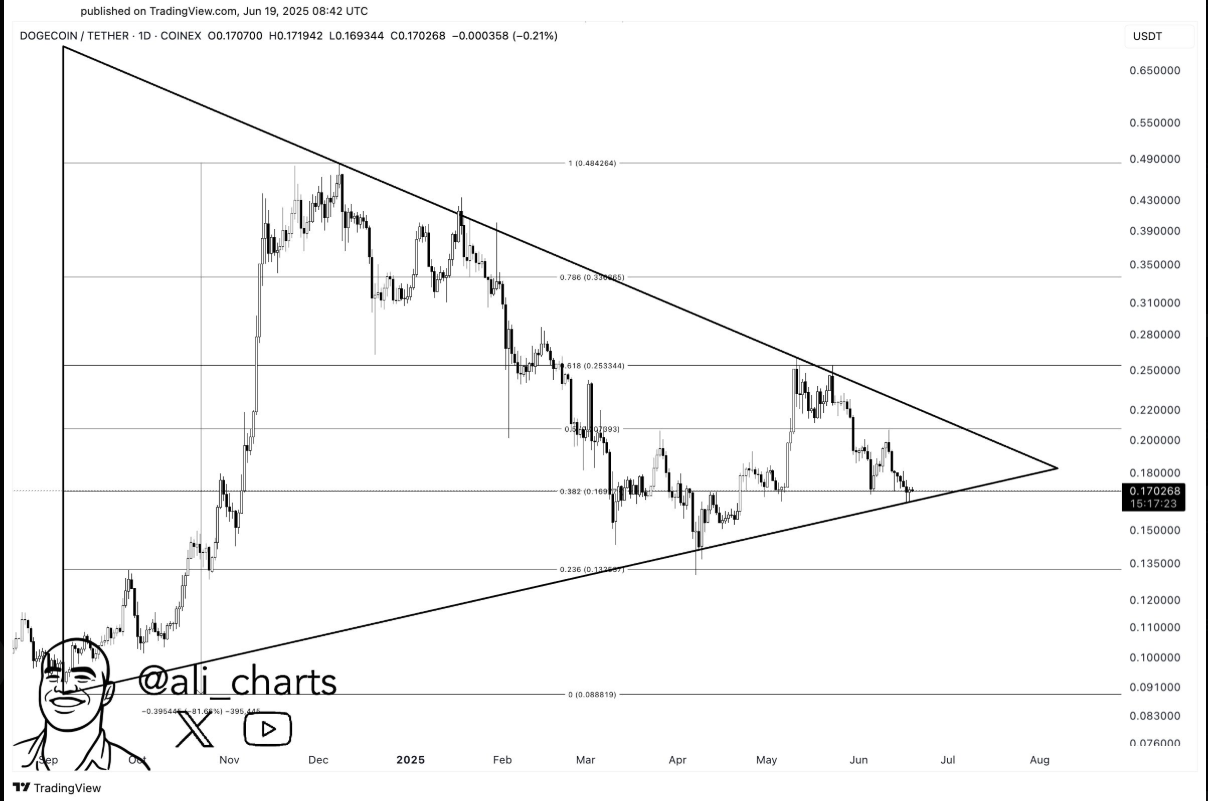 Martinez points out that the symmetrical triangle pattern presents two possible scenarios based on the direction of the breakout. Should Dogecoin break through $0.22, it could initiate a 60% upward climb. Conversely, a breakdown below the $0.16 support level could trigger a sharp decline, potentially driving the price down to $0.064.