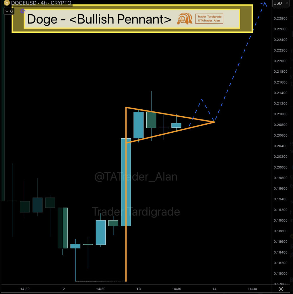 Trader Tardigrade also identified a Bullish Pennant on DOGE’s 4-hour chart, suggesting continuation of the recent upward move. The structure formed after a sharp rally and now sits between $0.2080 and $0.2120, indicating price compression.