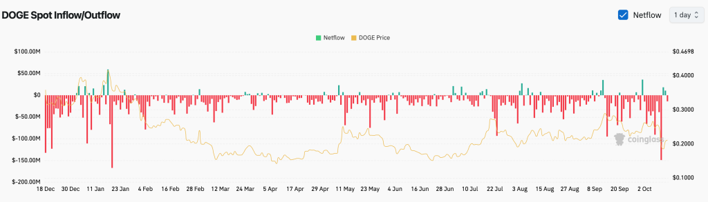 Despite recent gains, DOGE faced significant exchange outflows, as CoinGlass reported over $140 million in net outflows on October 10. This marked one of the largest daily withdrawals of the year and pointed to rising off-exchange accumulation.