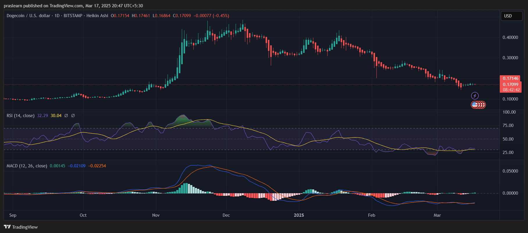 Dogecoin has steadily declined following a substantial bull run, exhibiting weakening momentum. The current price hovers around $0.17, struggling to gain upward traction. This bearish sentiment is fueled by a broader market correction and waning retail enthusiasm.