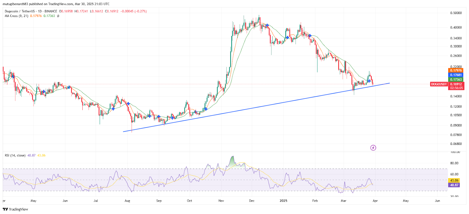 Maintaining support around $0.165 could drive Dogecoin towards $0.20–$0.24. A weekly close above $0.24 might confirm positive momentum. Conversely, breaking the trendline support could trigger a decline to $0.13–$0.14.