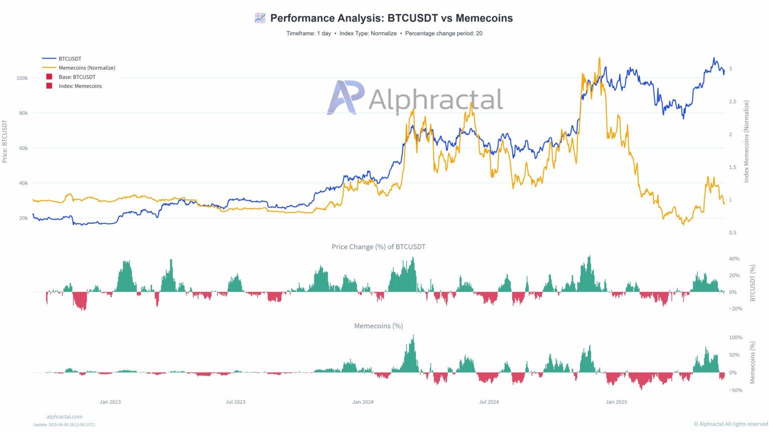 A comparative analysis reveals BTCUSDT outperforming the memecoin index, with the divergence widening since the beginning of the year.
