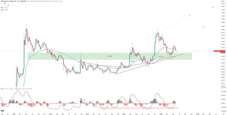 Supporting indicators include the alignment of the 50-week and 200-week moving averages below the current price. Momentum indicators, such as the MACD, suggest a potential return of bullish strength, although further confirmation is required. Since late 2022, DOGE has established higher lows, indicating gradual accumulation.