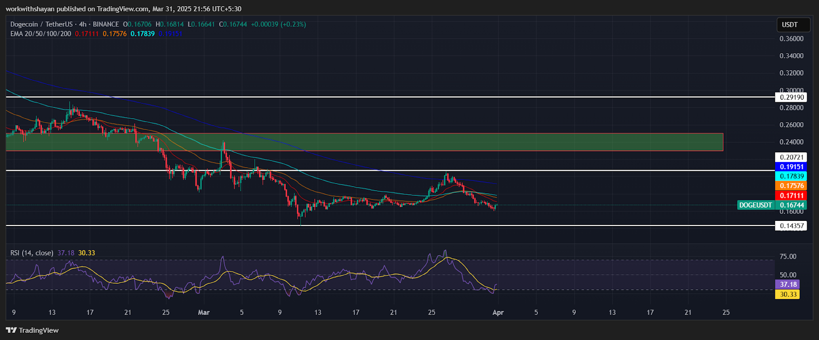 The declining 20-day EMA ($0.171) and a Relative Strength Index (RSI) below the midpoint reinforce the bearish short-term sentiment. The DOGE/USDT pair may retest the $0.143 support level. A break below this could push the price towards $0.11.