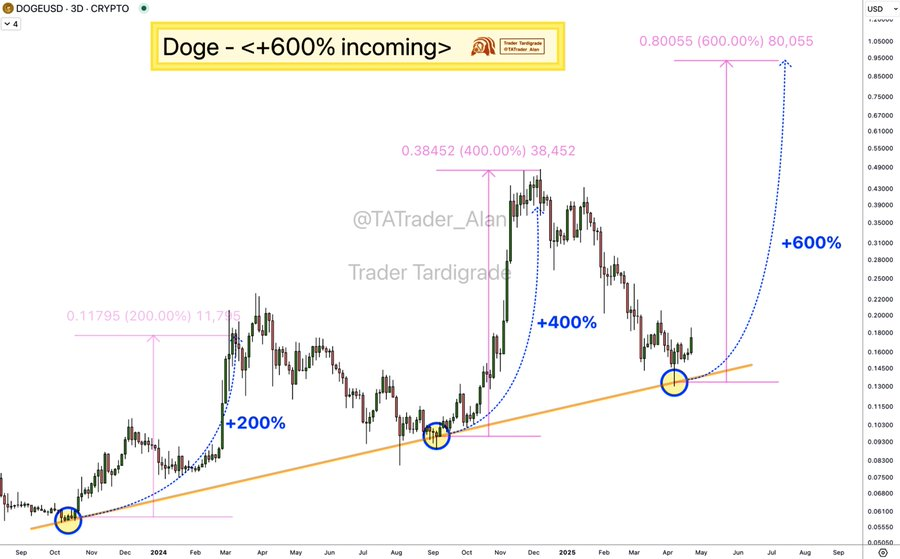 Tardigrade's analysis shows three key support bounces resulting in gains of 200%, 400%, and a projected 600%. Each rally started near the trendline, following higher lows and maintaining structural consistency. These rallies include moves from $0.04 to $0.11795, and from $0.06 to $0.38452. The latest bounce near $0.115 projects a move towards $0.80055. Tardigrade emphasizes the trendline's reliability, highlighting the timing and magnitude of each bounce. This projection follows a steep parabolic arc, without using indicators like RSI or volume, and is based solely on price history and technical structures.