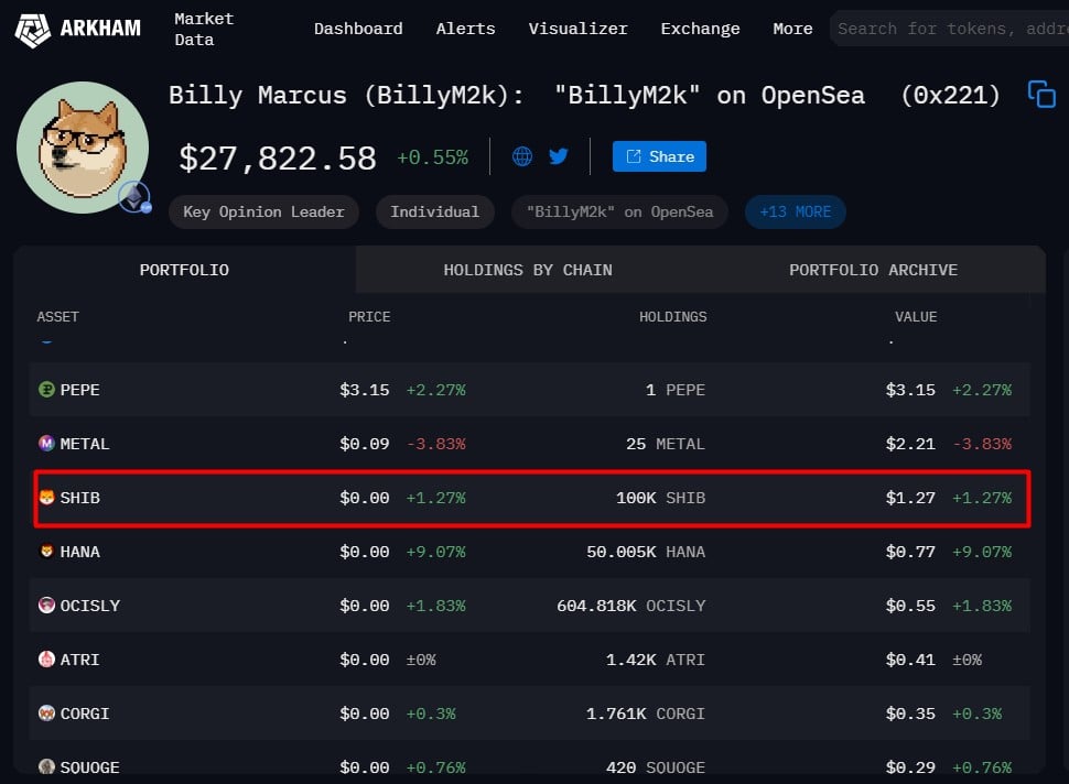 Data from Arkham Intelligence reveals a wallet belonging to Billy Markus currently holding zero Dogecoin. This contrasts with his October tweet claiming ownership of 226,317.86 DOGE. However, Arkham's data now shows the wallet's contents consist primarily of various small-cap cryptocurrencies, including 0.227 ETH and 100,000 Shiba Inu. SHIB, the second-largest meme coin by market capitalization, initially positioned itself as a "Doge killer."