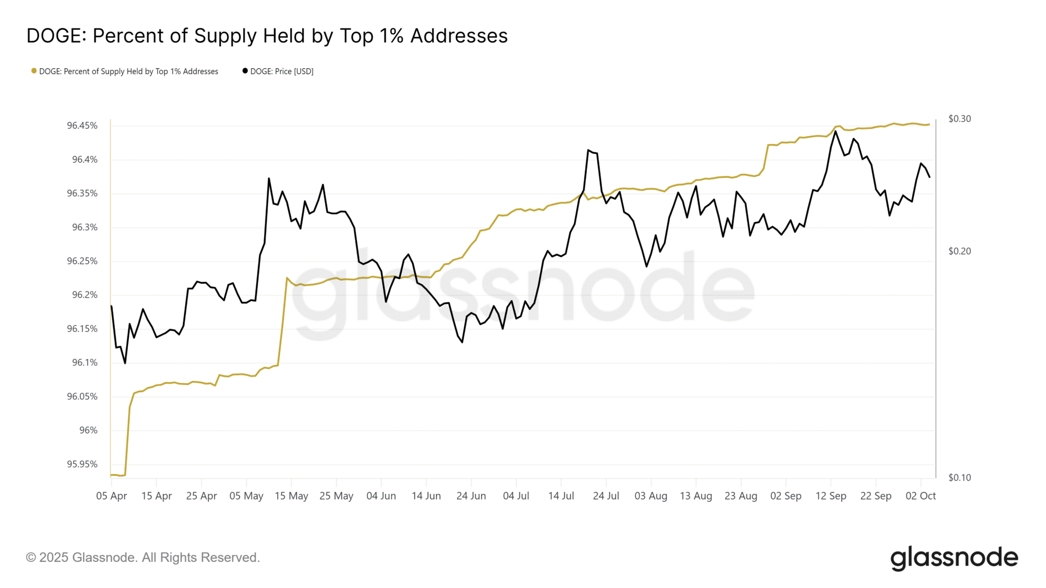 Dogecoin has started the fourth quarter with renewed momentum after weathering a $20 billion pullback in the memecoin sector during September. The token closed the month with a 9% return on investment, with top 1% addresses now controlling 96.45% of the supply.