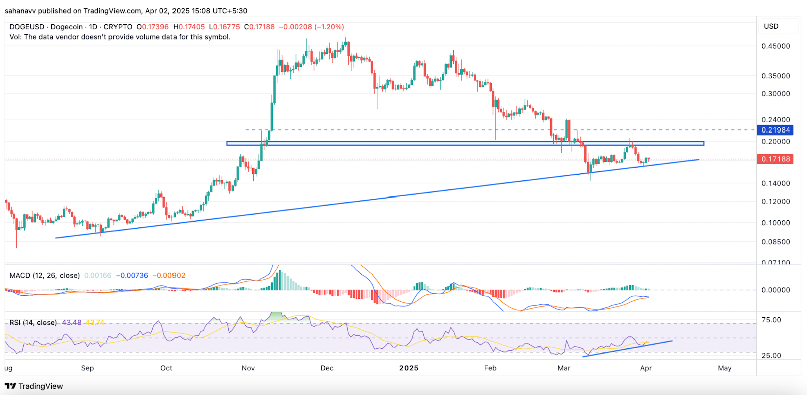 This $0.20 level has acted as both support and resistance. A decisive break above this range would likely boost market confidence. The recent slight increase in trading volume suggests increased bullish activity, potentially pushing Dogecoin (DOGE) beyond $0.25.
