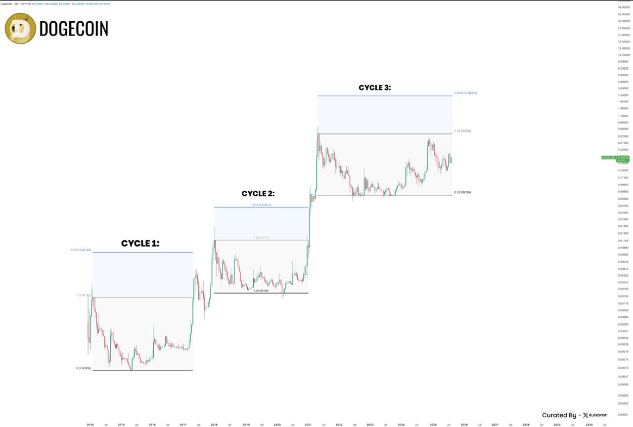 Dogecoin price currently trades at $0.2453, reflecting a rise of 23.34% over the past week and 8.13% in the last 24 hours. Analysts are observing recurring cycle patterns and bullish technical formations, suggesting the potential for substantial gains should key resistance levels be surpassed.