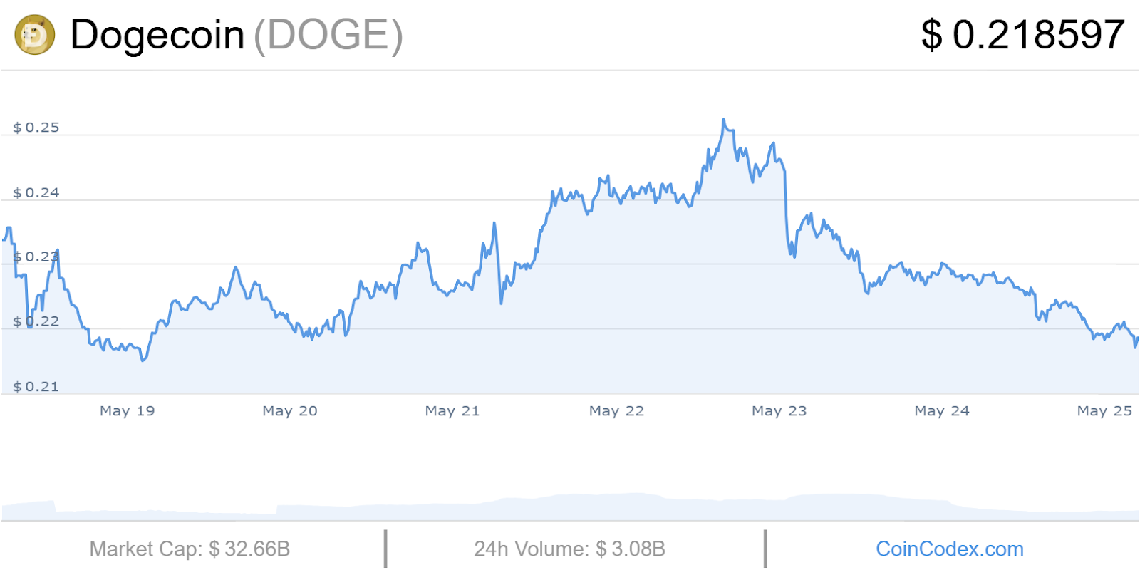 However, 2021 saw a dramatic surge, reaching an all-time high (ATH) of $0.73 within the first five months. Unfortunately, this rally proved unsustainable, and the price has since fallen by 70% from its ATH. Currently, DOGE trades around $0.21, down approximately 6% in the last four weeks.