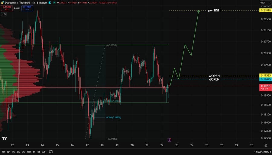 According to CarlMoon, “DOGE is holding the golden pocket support. If bulls reclaim the weekly open, a breakout could form.” The one-hour chart shows a rebound from $0.1820 toward $0.1920, reflecting renewed short-term strength. Consolidation may be seen before possible upward continuation by price levels close to the daily and weekly opens at $0.1940 and $0.1953 respectively.