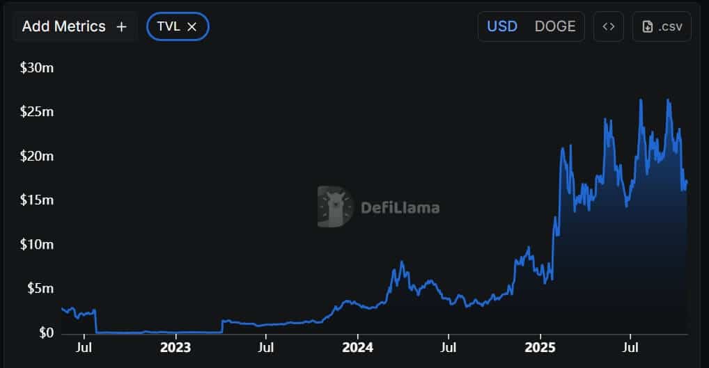Data from DeFiLlama shows Dogecoin’s total value locked in DeFi at $16.85 million, reflecting stable engagement. Chain fees and revenue over the past 24 hours each stood at $2,176.