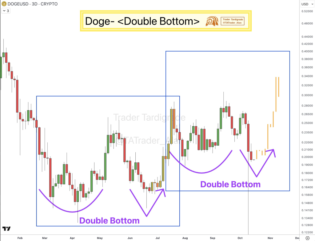 - Dogecoin forms Double Bottom pattern with potential upside toward $0.30–$0.33 if confirmed.