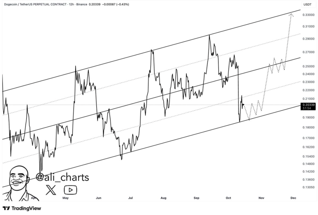Moreover, Analyst Ali adds that DOGE continues to trade within an ascending parallel channel on the 12-hour chart. Maintaining support at $0.19 could lead to further gains toward $0.25, $0.27, and the $0.33 channel resistance.
