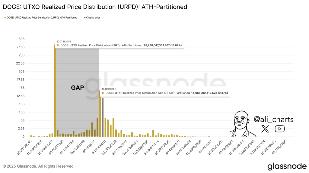 Glassnode data reveals a realized price gap between $0.19 and $0.07, with limited on-chain activity in this range. Clusters around $0.199 and $0.0739 show significant value concentration, suggesting volatility could increase if DOGE breaks out of the current zone.