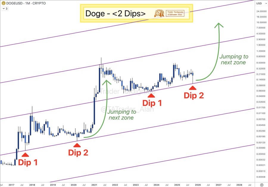 Trader Tardigrade noted that Dogecoin’s broader pattern mirrors its historical two-dip structure seen between 2018 and 2021, which preceded a major breakout. The current 2023–2025 setup reflects a similar rising channel formation, showing steady support and compression near the lower boundary.