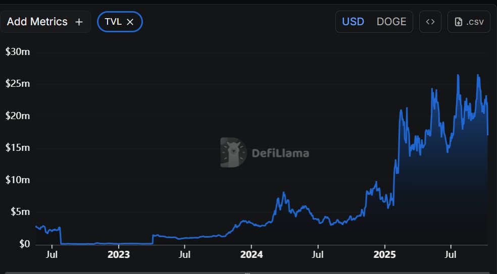 According to data from DeFiLlama, Dogecoin’s total value locked (TVL) stands at $17.06 million, down 21.71% in 24 hours, but still much higher than levels seen in early 2024. The network recorded $3,055 in 24-hour chain fees and revenue, confirming steady on-chain activity.