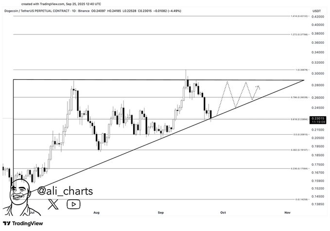 Ali (@ali_charts) added that Dogecoin must defend $0.22 to pursue a rebound toward the triangle’s x-axis at $0.29. The chart shows repeated rejections from higher levels, leaving DOGE exposed but still above critical structural support.