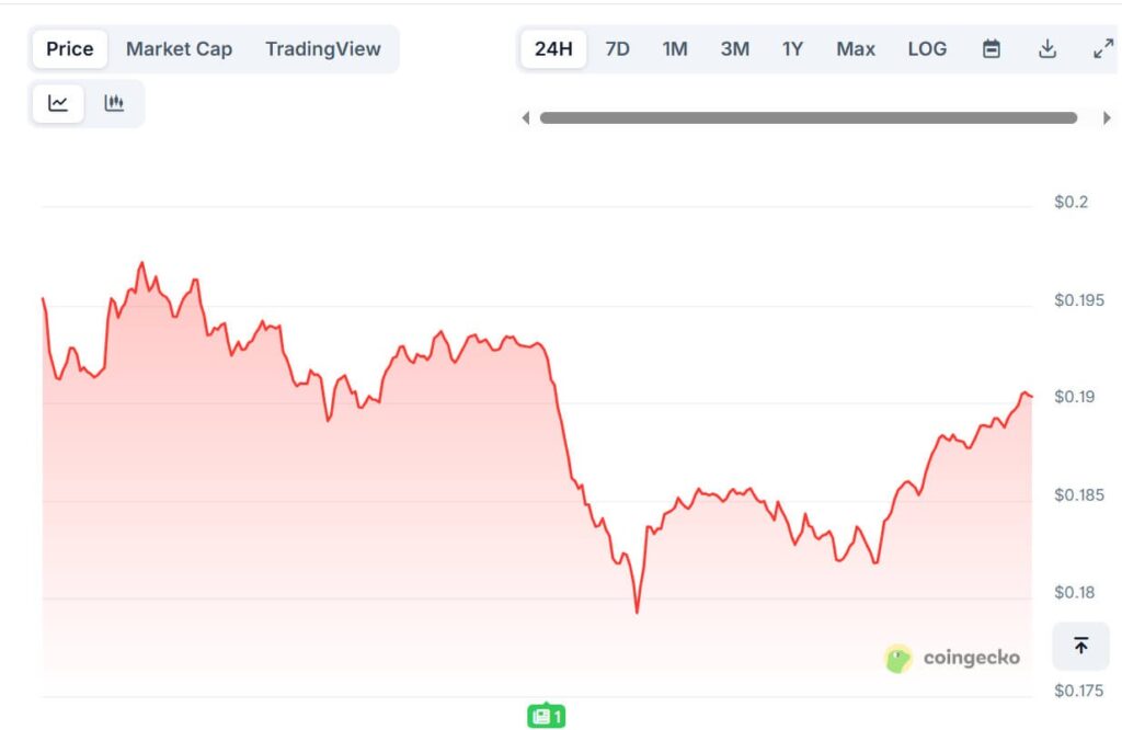 Dogecoin trades near $0.1904, marking a 2.6% decline in the past 24 hours, based on data from CoinGecko. Its 24 hours range is between $0.1793 and $0.1972 with a market capitalization of $28.79 billion and trading volume of $4.39 billion. Circulating supply stands at 151.28 billion coins.