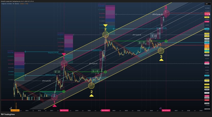 According to an observation by Olivier D Maximus, Dogecoin’s long-term trend remains intact, as prices continue to respect a decade-long ascending channel. As DOGE trades around $0.19, technical and on-chain data support the possibility of renewed upward movement toward $0.48 once momentum strengthens.