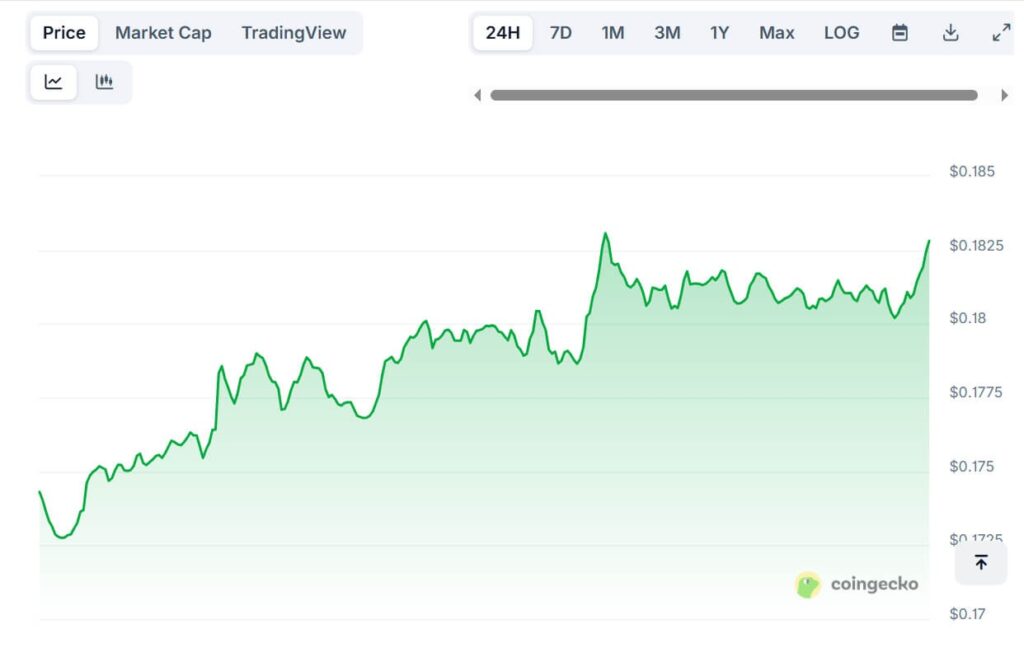 Every touchpoint at the lower support level has historically triggered renewed price strength, confirming the ongoing stability of this formation. Dogecoin trades at $0.1828, reflecting a 4.9% daily increase within a 24-hour range of $0.1727 to $0.1831. It has a market capitalization of $27.66 billion with a trading volume of $1.93 billion within the same time period according to Coingecko data.