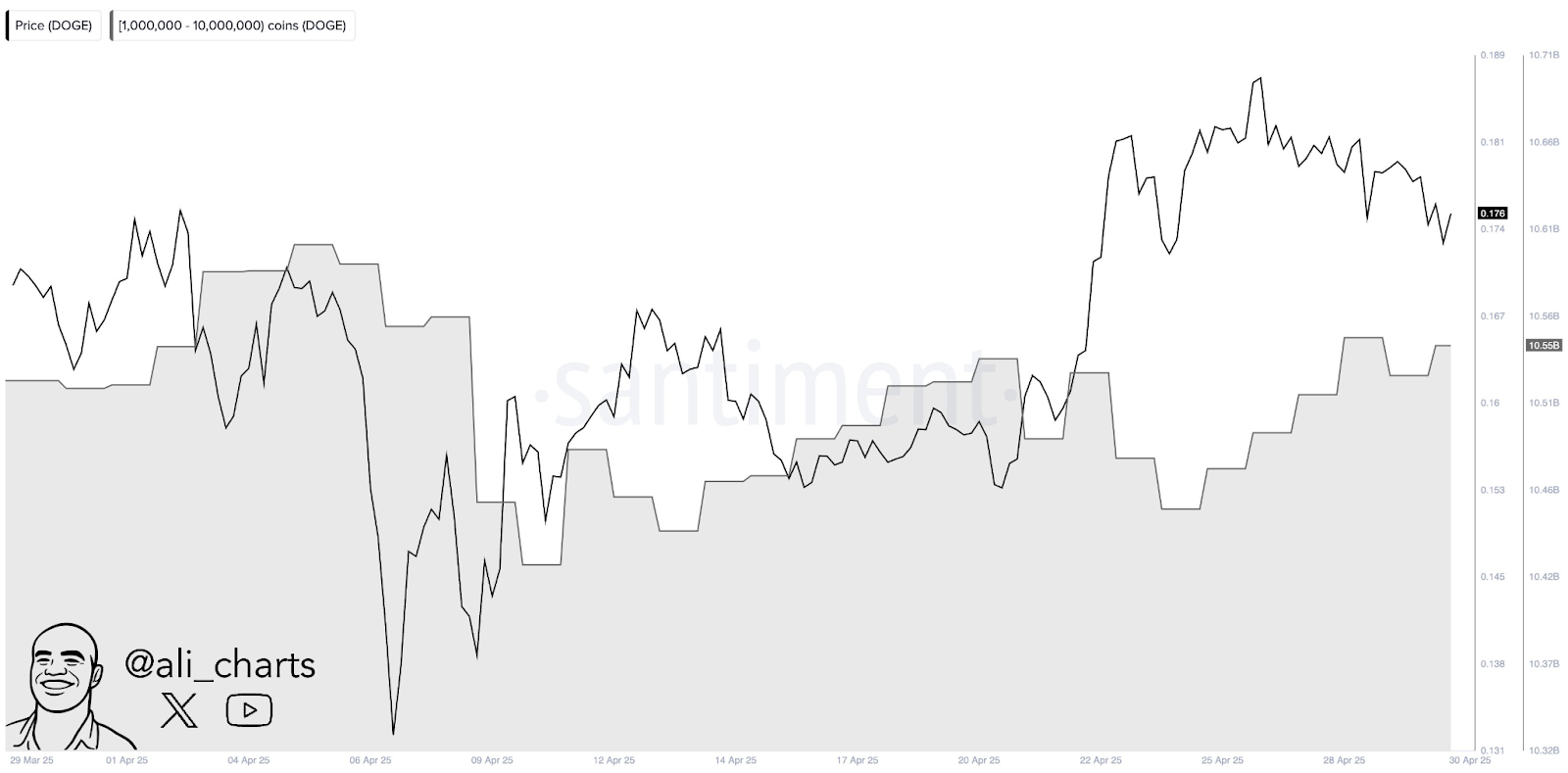 Recent whale accumulation adds to the bullish outlook. On-chain analyst Ali Martinez reports that whales have purchased approximately 100 million DOGE in the past week – a pattern historically preceding price rallies.