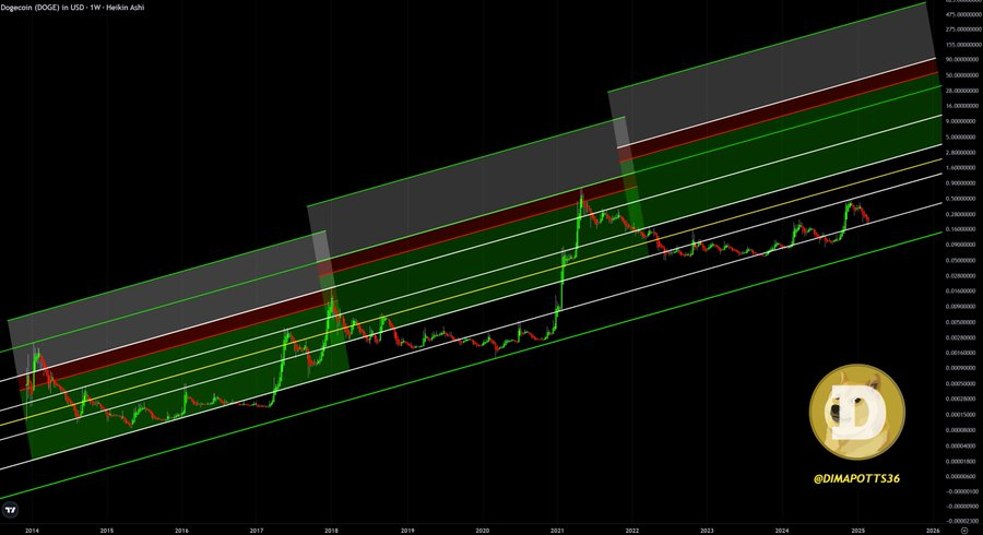 Currently, the lower boundary of this red zone sits at $26. This level gradually increases due to the chart's slope, establishing it as the minimum target for this cycle. Historical data indicates a structured price path for Dogecoin, suggesting a potential repetition of this pattern.