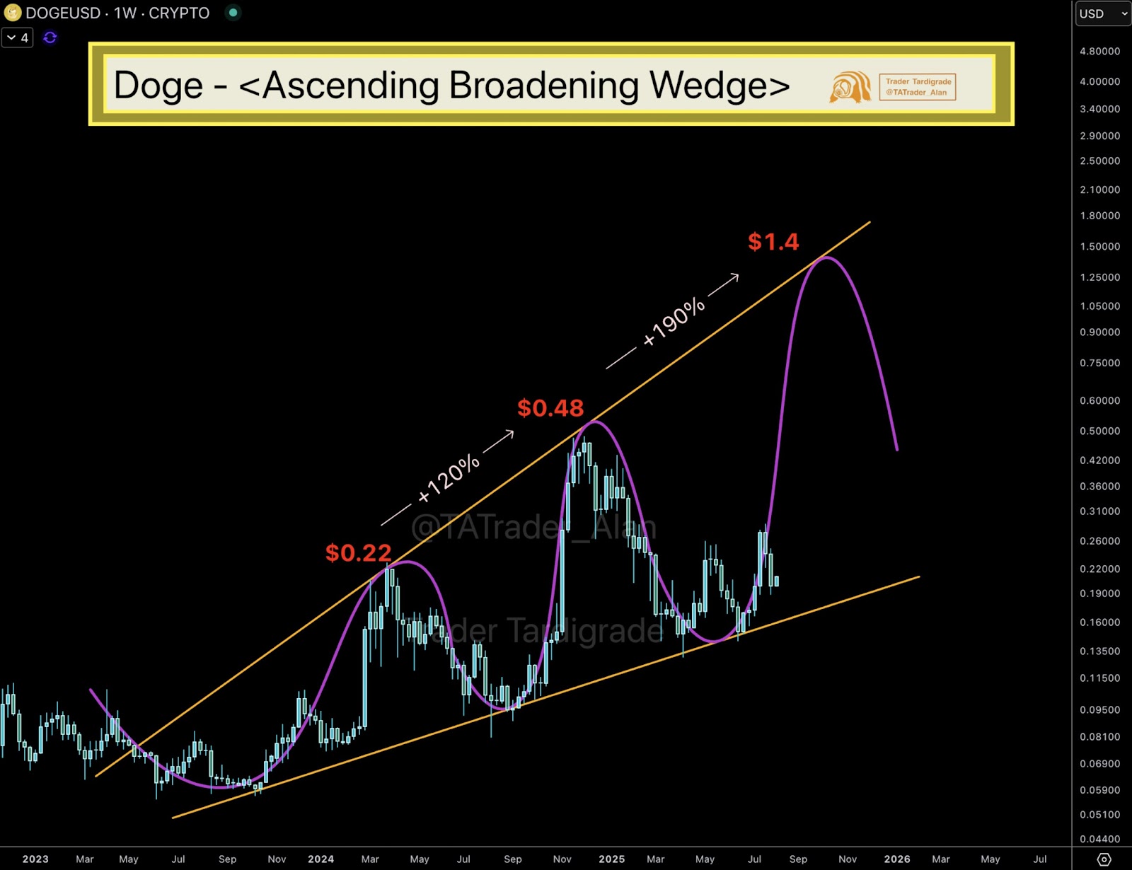 Analysts have observed Dogecoin's movement within an ascending broadening wedge pattern. Projections place the next target at the top of the wedge, around $1.4.