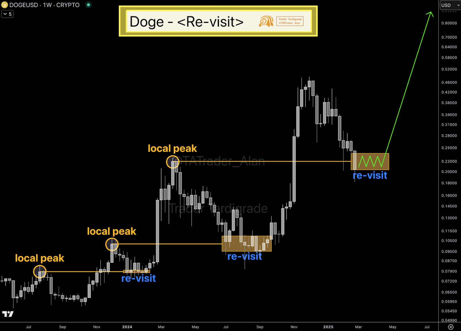 Trader Tardigrade notes that Dogecoin is currently testing a previous high, a pattern observed before previous rallies. Consolidation around this resistance-turned-support level suggests accumulation, similar to previous instances that preceded strong bullish moves. This historical precedent of higher highs and higher lows strengthens the long-term bullish outlook.