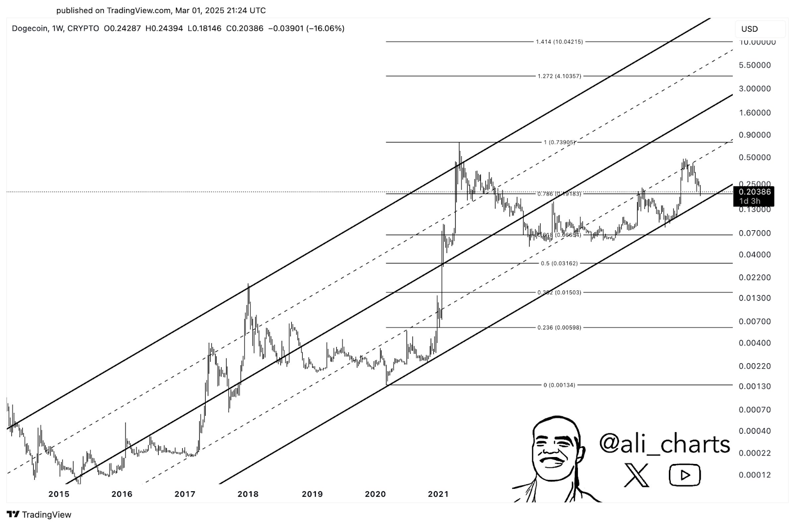 Fibonacci levels have consistently influenced Dogecoin's price. For example, the 0.236 level ($0.00598) fueled the 2021 rally past $0.50. The 0.382 and 0.50 levels ($0.01693 and $0.03163 respectively) historically served as accumulation zones preceding significant price increases. The current price ($0.20386) is near the 0.618 level ($0.11837), a historically significant turning point; maintaining support here could fuel another breakout.