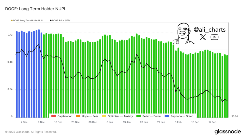 The Net Unrealized Profit/Loss (NUPL) metric for long-term Dogecoin (DOGE) holders suggests a state of denial among investors as their unrealized profits dwindle.